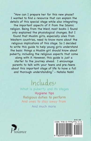 "How can I prepare her for this new phase? I wanted to find a resource that can explain the details of this special stage while also integrating the important aspects of it from the Islamic religion. Being from the West, most books I found only explained the physiological changes. But I found that Muslim girls, especially ones from Western countries, need to know more about the religious implications of this stage. So I decided to write this guide to help young girls understand the basic things a Muslim girl should know about puberty, including the religious aspects that come along with it. However, this guide is just a starter to the journey ahead. I encourage parents to talk with your teens and pre-teens about this important stage of life to have a full and thorough understanding." - Natalia Nabil Includes: What is puberty and its stages. Hygiene tips. Religious duties to perform. And ones to stay away from. And much more