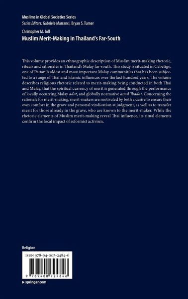This volume provides an ethnographic description of Muslim merit-making rhetoric, rituals and rationales in Thailand's Malay far-south. This study is situated in Cabetigo, one of Pattani's oldest and most important Malay communities that has been subjected to a range of Thai and Islamic influences over the last hundred years. The volume describes religious rhetoric related to merit-making being conducted in both Thai and Malay, that the spiritual currency of merit is generated through the performance of locally occurring Malay adat , and globally normative amal 'ibadat. Concerning the rationale for merit-making, merit-makers are motivated by both a desire to ensure their own comfort in the grave and personal vindication at judgment, as well as to transfer merit for those already in the grave, who are known to the merit-maker. While the rhetoric elements of Muslim merit-making reveal Thai influence, its ritual elements confirm the local impact of reformist activism.