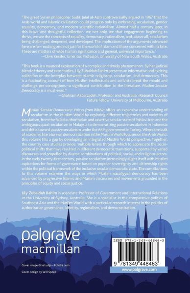 "The great Syrian philosopher Sadik Jalal al-Azm controversially argued in 1967 that the Arab world and Islamic civilization could progress only by embracing secularism, gender equality, democracy, and modern scientific rationalism. Almost half a century later, in this brave and thoughtful collection, we not only see that engagement beginning to thrive, we see the concepts of equality, democracy, rationalism, and, above all, secularism being challenged, deepened, and developed. The implications of the arguments advanced here are far-reaching, and not just for the world of Islam and those concerned with its fate. These are matters of wide human significance and general, universal importance." - Clive Kessler, Emeritus Professor, The University of New South Wales, Ausralia "This book is a nuanced exploration of a complex and timely phenomenon. By her judicial blend of theory and case studies, Lily Zubaidah Rahim presents an informative and exciting collection on the interplay between Islamic religiosity, secularism and democracy. This is a fascinating account of how Muslim intellectuals and activists break the mold and challenge pre-conceptions - a significant contribution to the literature. Muslim Secular Democracy is a must-read." - Shahram Akbarzadeh, Australian Research Council Future Fellow, University of Melbourne, Australia