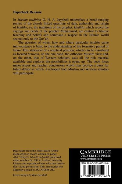 In Muslim tradition G. H. A. Juynboll undertakes a broad-ranging review of the closely linked questions of date, authorship and origin of hadiths, i.e. the traditions of the prophet. Hadiths which record the sayings and deeds of the prophet Muhammad, are central to Islamic teaching and beliefs and command a respect in the Islamic world second only to the Qur'an.