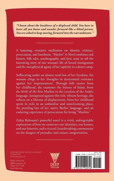 "A love letter to us: the outcasts, the hyphenated "others," those who have lost tongues and gained dialects. Zahia Rahmani speaks to the religious fairy tales of my girlhood, the Muslim lore we listened to while learning the Arabic alphabet. "Muslim" challenges the borders of genre, much like Rahmani pushes up against the boundaries of multiple, overlapping identities, investigating imposed definitions and complicating what it means to be colonized, woman, Muslim." - Dr. Seema Yasmin