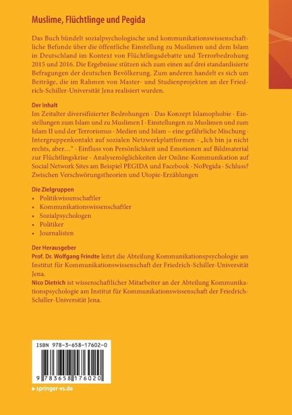 Das Buch bündelt sozialpsychologische und kommunikationswissenschaftliche Befunde über die öffentliche Einstellung zu Muslimen und dem Islam in Deutschland im Kontext von Flüchtlingsdebatte und Terrorbedrohung 2015 und 2016. Die Ergebnisse stützen sich zum einen auf drei standardisierte Befragungen der deutschen Bevölkerung. Zum anderen handelt es sich um Beiträge, die im Rahmen von Master- und Studienprojekten an der Friedrich-Schiller-Universität Jena realisiert wurden.
