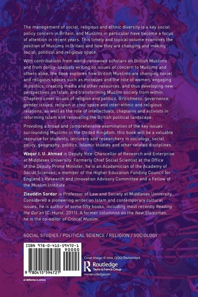 The management of social, religious and ethnic diversity is a key social policy concern in Britain, and Muslims in particular have become a focus of attention in recent years. This timely and topical volume examines the position of Muslims in Britain and how they are changing and making social, political and religious space. With contributions from world renowned scholars on British Muslims and from policy makers writing on issues of concern to Muslims and others alike, the book explores how British Muslims are changing social and religious spaces such as mosques and the role of women, engaging in politics, creating media and other resources, and thus developing new perspectives on Islam and transforming Muslim society from within. Chapters cover issues of religion and politics, Britishness, governance, parallel lives, gender issues, religion in civic space, ethnicity, and inter ethnic and religious relations, as well as the role of intellectuals, chaplains and activists in reforming Islam and renovating the British political landscape. Providing a broad and comprehensive examination of the key issues surrounding Muslims in the UK, this book will be a valuable resource for students, lecturers and researchers in sociology, social policy, geography, politics, Islamic studies and other related disciplines.