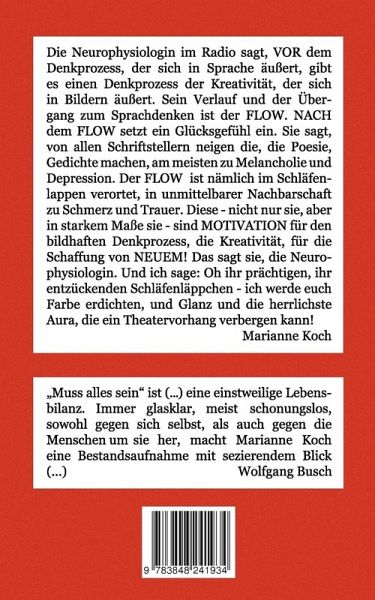 Marianne Kochs erster Lyrikband sammelt Gedichte mit drei großen thematischen Schwerpunkten: zum einen Gedichte über "die Dinge des Lebens",nämlich die Liebe und den Tod und das Scheitern und die Lebenskrisen und die Hoffnung, zum anderen die Naturgedichte, in denen der Rhythmus von Jahreszeiten und Menschenleben sich als die einzige Lösung für die Gottverlassenheit der Welt anbietet. Eine Todesphantasie im Gedicht "Das Ende" kommt beispielsweise als prächtiges Naturereignis daher: "...wird der Duft der wilden Kamille mich umhauen und ich werde ruhn". Die dritte Gruppe der Gedichte ist mit dem Begriff "Zeitenwenden" überschrieben. Aus diesen Gedichten spricht die Lebenserfahrung und der Lebenszweifel, auch die politisch argumentierende Anklage der in den 50er und 60er Jahren Geborenen. Im Gedicht "Die Enkel des Kriegs" heißt es: "Geboren wurden wir in vollen Töpfen umgeben von hungernden Augen", und später: "Immer und immer beim Gang unter der Sonne ist da der kalte Luftstrom durch die hungernden, hohlen Augen." In Gedichten wie "Wiederaufbau", "Zeitenwenden", "Soldat und Kind", "Hiroshima" hören wir durch die Stimmen der "Kriegsenkel" die in Wahrheit verstummten Kriegskinder, die ihr Trauma nicht verarbeitet, sondern an ihre Kinder weiter gegeben haben. Doch: "MUSS ALLES SEIN", der Titel des Leitgedichtes und des ganzen Bandes wendet den Blick aus der Vergangenheit in die Zukunft und bringt innere Versöhnung mit dem äußeren Unfrieden - ohne ihn zu leugnen. Obwohl Marianne Koch in "Absprache" Gott deutlich erklärt, dass sie "zum Beten nicht geeignet" sei, ist ihr"Muss alles sein" - ein geradezu tief religiöses Mantra.
