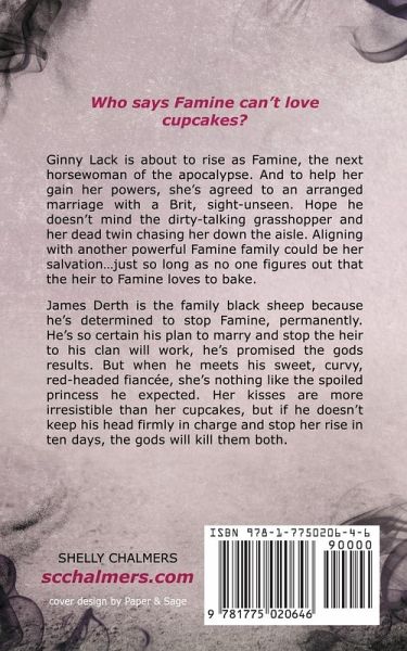 Who says Famine can't love cupcakes? Ginny Lack is about to rise as Famine, the next horsewoman of the apocalypse, and needs an ally to help her gain her abilities. Agreeing to an arranged marriage with a Brit, sight unseen, doesn't seem so bad considering her symbolic "horse" is a gutter-minded talking grasshopper, and her dead twin is stalking her. Aligning with another powerful Famine family through marriage will provide the confidant she craves and keep her secrets. How would it look if the other clans knew the heir to Famine loves baking? James Derth is the family black sheep because he's devoted his life to combating Famine. Agreeing to marry the heir to his clan is the opportunity he's been waiting for to stop famine permanently, and he's promised the gods results. How hard can it be to stop a spoiled Famine princess from rising? But when he meets his new fiancée, the sweet, curvy redhead is nothing like he expected. Her kisses are as irresistible as her cupcakes and twice as hazardous to his heart. Keeping his distance will be a whole lot harder, but he better find a way to stop her…or the gods will kill them both in ten days.