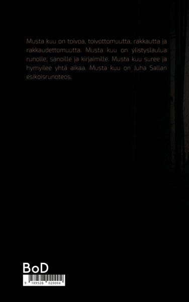 Musta kuu on toivoa, toivottomuutta, rakkautta ja rakkaudettomuutta. Musta kuu on ylistyslaulua runolle, sanoille ja kirjaimille. Musta kuu suree ja hymyilee yhtä aikaa. Musta kuu on Juha Sallan esikoisrunoteos.