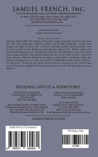 2m,3f / Drama / Interior Mustang Sally tackles the timely and sensitive topic of female teachers who have sex with their underage students, justice, and double standards. As the play begins, the affair between Sal, a 13-year old male middle school student, and his 31-year old teacher, Kathy, has already been discovered. Kathy's older, successful and high-powered, commitment phobic sister Elizabeth, steps forward to take charge and help. She quickly enlists the aid of one of her suitors, a divorced male attorney, Edward. Elizabeth attempts to solve Kathy's problems while also trying to navigate her own life, and curb her religiously fanatic mothers destructive behavior. Along the way, deep family issues are uncovered, the result being an involving and insightful drama that provides food for thought about serious subjects.