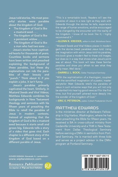 Jesus told stories. His most powerful stories were parables about the kingdom of God: The kingdom of God is like a mustard seed . . . The kingdom of God is like a persistent widow . . . The kingdom of God is like a man who had two sons . . . Jesus's stories have captivated hearts for thousands of years. Countless books and sermons have been written and preached explaining the background of these parables, but these dry explanations can rob the parables of their beauty and ""punch."" Think about it: if you explain a joke, it isn't funny. Jesus's parables primarily captivated the heart. Similarly, in Mustard Seeds and Viral Videos, Matthew Edwards combines his backgrounds in New Testament theology and semiotics with his fifteen years of preaching the Bible to retell the parables of Jesus in modern contexts. Instead of explaining that the kingdom of God is like a mustard seed because it starts small and grows big, Edwards tells a story of a video that goes viral. Each chapter is a different story of the kingdom of God based on a different parable of Jesus.
