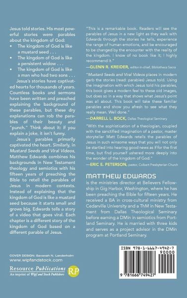 Jesus told stories. His most powerful stories were parables about the kingdom of God: The kingdom of God is like a mustard seed . . . The kingdom of God is like a persistent widow . . . The kingdom of God is like a man who had two sons . . . Jesus's stories have captivated hearts for thousands of years. Countless books and sermons have been written and preached explaining the background of these parables, but these dry explanations can rob the parables of their beauty and ""punch."" Think about it: if you explain a joke, it isn't funny. Jesus's parables primarily captivated the heart. Similarly, in Mustard Seeds and Viral Videos, Matthew Edwards combines his backgrounds in New Testament theology and semiotics with his fifteen years of preaching the Bible to retell the parables of Jesus in modern contexts. Instead of explaining that the kingdom of God is like a mustard seed because it starts small and grows big, Edwards tells a story of a video that goes viral. Each chapter is a different story of the kingdom of God based on a different parable of Jesus.