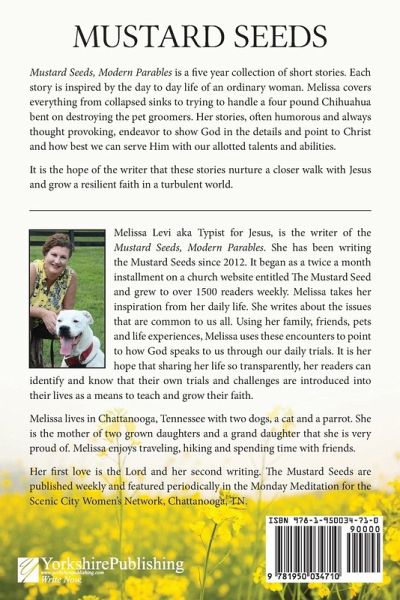 Mustard Seeds, Modern Parables is a five year collection of short stories. Each story is inspired by the day to day life of an ordinary woman. Melissa covers everything from collapsed sinks to trying to handle a four pound Chihuahua bent on destroying the pet groomers. Her stories, often humorous and always thought provoking, endeavor to show God in the details and point to Christ and how best we can serve Him with our allotted talents and abilities. It is the hope of the writer that these stories nurture a closer walk with Jesus and grow a resilient faith in a turbulent world.