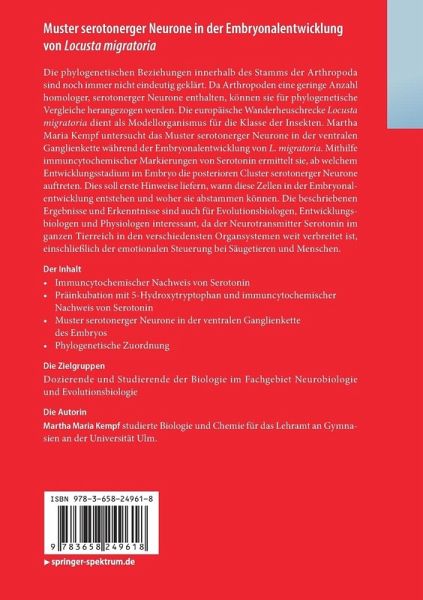 Die phylogenetischen Beziehungen innerhalb des Stamms der Arthropoda sind noch immer nicht eindeutig geklärt. Da Arthropoden eine geringe Anzahl homologer, serotonerger Neurone enthalten, können sie für phylogenetische Vergleiche herangezogen werden. Die europäische Wanderheuschrecke Locusta migratoria dient als Modellorganismus für die Klasse der Insekten. Martha Maria Kempf untersucht das Muster serotonerger Neurone in der ventralen Ganglienkette während der Embryonalentwicklung von L. migratoria. Mithilfe immuncytochemischer Markierungen von Serotonin ermittelt sie, ab welchem Entwicklungsstadium im Embryo die posterioren Cluster serotonerger Neurone auftreten. Dies soll erste Hinweise liefern, wann diese Zellen in der Embryonalentwicklung entstehen und woher sie abstammen können. Die beschriebenen Ergebnisse und Erkenntnisse sind auch für Evolutionsbiologen, Entwicklungsbiologen und Physiologen interessant, da der Neurotransmitter Serotonin im ganzen Tierreich inden verschiedensten Organsystemen weit verbreitet ist, einschließlich der emotionalen Steuerung bei Säugetieren und Menschen.