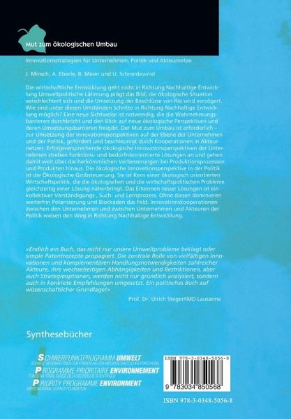 Eine nachhaltige Wirtschaftsweise steht in den Industrieländern noch aus - trotz zahlreicher Umweltinnovationen in Politik und Wirtschaft. Die Autoren dieses Synthesebuches gehen den Ursachen nach, zeigen wo die ökologische Innovationsoffensive in Unternehmen, in regionalen Akteurnetzen und in der Umweltpolitik heute steht und wie sie sich weiterentwickeln muss. Ihre Ergebnisse stützen sie auf ein interdisziplinäres Forschungsprojekt, in dem Volkswirte, Betriebswirte und Wirtschaftsgeographen am Beispiel der Schweiz Umweltinnovationen untersucht haben. Das Buch verbindet reichhaltige empirische Daten mit einer umfassenden konzeptionellen Analyse und zeigt: ökologischer Wandel kommt weder alleine von unten noch von oben. Er braucht vielmehr das geschickte Zusammenspiel von unternehmerischer Initiative, umweltpolitischer Rahmensetzung und geeignetem Netzwerkmangement.