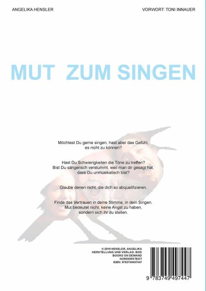Das Buch macht denjenigen Mut, die von sich glauben nicht singen zu können. Das nötige Know How wird vermittelt, um als Singungeübter und Entmutigter singen zu lernen. Dabei werden Stimm-und Atemtechnik berücksichtigt und auch die psychologische Herangehensweise. Zahlreiche Tipps und Tricks erleichtern den Zugang zum Singen. Das Buch gibt auch Beratung wie man Lampenfieber und Versagensängste angeht. Übungen zur Schulung der Hörwahrnehmung und auditiven Konzentrationsfähigkeit werden vorgestellt. Fallbeispiele erhellen die Thematik. Auch allgemeinmenschliche Themen werden behandelt, z:B.: Kann ich aus Misserfolgen, Problemen und Krankheit lernen? Wie sinnerfüllt lebe ich mein Leben? Stimmt das so für mich oder stehen Änderungen an? Was ist mir wichtig?