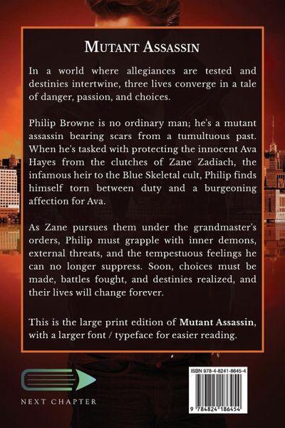 In a world where allegiances are tested and destinies intertwine, three lives converge in a tale of danger, passion, and choices. Philip Browne is no ordinary man; he's a mutant assassin bearing scars from a tumultuous past. When he's tasked with protecting the innocent Ava Hayes from the clutches of Zane Zadiach, the infamous heir to the Blue Skeletal cult, Philip finds himself torn between duty and a burgeoning affection for Ava. As Zane pursues them under the grandmaster's orders, Philip must grapple with inner demons, external threats, and the tempestuous feelings he can no longer suppress. Soon, choices must be made, battles fought, and destinies realized, and their lives will change forever. This is the large print edition of Mutant Assassin, with a larger font / typeface for easier reading.