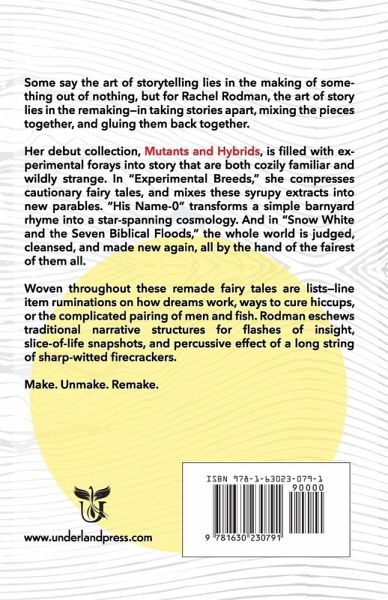 Some say the art of storytelling lies in the making of something out of nothing, but for Rachel Rodman, the art of story lies in the remaking-in taking stories apart, mixing the pieces together, and gluing them back together. Her debut collection, Mutants and Hybrids, is filled with experimental forays into story that are both cozily familiar and wildly strange. In "Experimental Breeds," she compresses cautionary fairy tales, and mixes these syrupy extracts into new parables. "His Name-0" transforms a simple barnyard rhyme into a star-spanning cosmology. And in "Snow White and the Seven Biblical Floods," the whole world is judged, clensed, and made new again, all by the hand of the fairest of them all. Woven throughout these remade fairy tales are lists-line item ruminations on how dreams work, ways to cure hiccups, or the complicated pairing of men and fish. Rodman eschews traditional narrative structures for flashes of insight, slife-of-life snapshots, and percussive effect of a long string of sharp-witted firecrackers. Make. Unmake. Remake. "Rachel Rodman's short, punchy experiments are a beautiful tightrope act of awe, wonder, and delicate surprise. Reading each one is like a delicious little treat, one you want to savor, and then return to again for seconds when you are done." -Paul Jessup, author of Daugther of the Wormwood Star "These are stories you can dip into whenever you need a palate cleanser from regular life." -Jennifer E. Hilt, author of The Trope Thesaurus "Rachel Rodman is the direct literary descendant of Angela Carter & a stealthy assassin of the Brothers' Grimm." -Jessica Hagy, author of One Morning