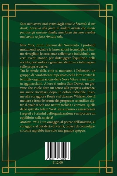 New York, primi decenni del Novecento. I profondi mutamenti sociali e le innovazioni tecnologiche hanno risvegliato le coscienze collettive e individuali, ma certi eventi stanno per distruggere l'equilibrio della società, portandola a guardarsi dentro e a interrogarsi sulle proprie derive.Tra le strade della città si muovono i Difensori, un gruppo di combattenti impegnato nella lotta contro la temibile organizzazione della Nova Vita e le sue attività agghiaccianti. A loro si unisce Sam Dawet, un giovane che vuole dare un senso alla propria esistenza, ma anche riscattarsi dopo un dolore indicibile. Insieme alla coraggiosa Ronja e al bizzarro Whisker, dovrà mettere a freno le brame del progresso scientifico dietro il quale si cela una natura torbida e corrotta, quella dello spietato Adam West. Riusciranno a smascherare i segreti e i crimini dell'organizzazione e a riportare un equilibrio nella società?Mutatio 1933 è un omaggio al potere dell'amicizia, al coraggio e al desiderio di verità, capace di coinvolgerci come saprebbe fare solo una grande epopea.