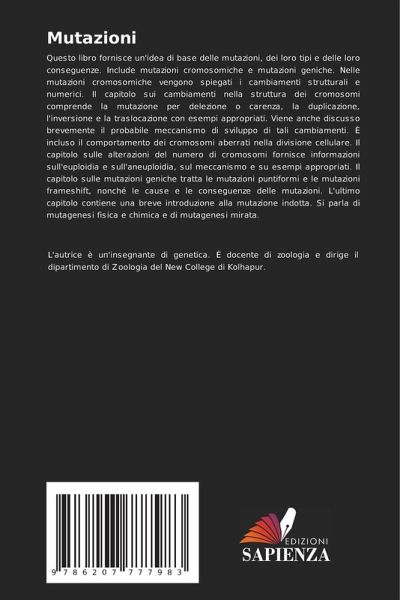 Questo libro fornisce un'idea di base delle mutazioni, dei loro tipi e delle loro conseguenze. Include mutazioni cromosomiche e mutazioni geniche. Nelle mutazioni cromosomiche vengono spiegati i cambiamenti strutturali e numerici. Il capitolo sui cambiamenti nella struttura dei cromosomi comprende la mutazione per delezione o carenza, la duplicazione, l'inversione e la traslocazione con esempi appropriati. Viene anche discusso brevemente il probabile meccanismo di sviluppo di tali cambiamenti. È incluso il comportamento dei cromosomi aberrati nella divisione cellulare. Il capitolo sulle alterazioni del numero di cromosomi fornisce informazioni sull'euploidia e sull'aneuploidia, sul meccanismo e su esempi appropriati. Il capitolo sulle mutazioni geniche tratta le mutazioni puntiformi e le mutazioni frameshift, nonché le cause e le conseguenze delle mutazioni. L'ultimo capitolo contiene una breve introduzione alla mutazione indotta. Si parla di mutagenesi fisica e chimica e di mutagenesi mirata.