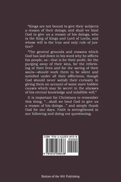 "Kings are not bound to give their subjects a reason of their doings; and shall we bind God to give us a reason of his doings, who is the King of kings and Lord of Lords, and whose will is the true and only rule of justice? "The general grounds and reasons which God has laid down in his word why he afflicts his people, as-that is for their profit, for the purging away of their sins, for the reforming of their lives and for the saving of their souls-should work them to be silent and satisfied under all their afflictions; though God should never satisfy their curiosity in giving them an account…mehr
