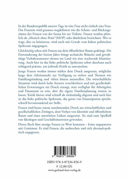 In der Bundesrepublik unserer Tage ist eine Frau nicht einfach eine Frau. Das Frausein wird genauso wegdefiniert wie die Schutz- und Rückzugsräume der Frauen von der Sauna bis zur Toilette. Frauen werden plötzlich als "Mensch ohne Penis" (MOP) oder "Person mit Bonusloch" bezeichnet. Wer es wagt, dies zu kritisieren, wird auch mit Gewalt vom linken politischen Spektrum angegangen. Gleichzeitig sehen sich Frauen aus dem öffentlichen Raum gedrängt. Die Einwanderung der letzten Jahre bringt archaische Bräuche und gewalttätige Verhaltensmuster ebenso ins Land wie eine wachsende Islamisierung. Auch hier ist das linke politische Spektrum sofort durchaus auch schlagend präsent, um jedwede Kritik zu unterjochen. Junge Frauen werden immer stärker dem Druck ausgesetzt, möglichst lange dem Arbeitsmarkt zur Verfügung zu stehen und Themen wie Familiengründung und -leben hinten anzustellen. Die wirtschaftliche Situation wird durch hohe Steuern verschlechtert und mit gesellschaftlichen Erwartungen ein Druck erzeugt, stets verfügbar für Arbeitgeber und Finanzamt zu sein, aber die eigene Familienplanung warten zu lassen. Kritik hieran wird schnell als rückständig abgetan und auch hier ist das linke politische Spektrum, das gerne von Emanzipation spricht, schnell bevormundend zur Stelle. Frauen sind heute einem zunehmenden Druck aus wirtschaftlichen und gesellschaftlichen Zwängen, dem Verlust von Identität und öffentlichem Raum und einer autoritären Linken ausgesetzt. Sie sind zum Spielball von Ideologen und Geschäftsinteressen geworden. Dieses Buch lässt mutige Frauen zu Wort kommen - keine angepassten mit Gratismut. Es sind Frauen, die ausbrechen und sich alternativpolitisch engagieren.