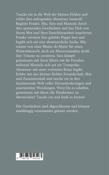 Tauche ein in die Welt der kleinen Helden und erlebe ihre aufregenden Abenteuer hautnah! Begleite Frauke, Mia, Sara und Manuela durch ihre spannenden Geschichten und lass Dich von ihrem Mut und ihrer Entschlossenheit inspirieren. Frauke vermisst ihre geliebte Puppe Susi und begibt sich auf eine abenteuerliche Suche. Mia träumt von einer Blume als Motiv für einen Malwettbewerb, doch ein Missverständnis droht ihre Träume zu zerstören. Sara kämpft gemeinsam mit ihren Eltern um ihr Paradies, während Manuela sich auf ein Trampolin-Abenteuer mit einer verletzten Katze begibt. Erlebe mit den kleinen Helden Freundschaft, Mut und Zusammenhalt und tauche ein in ihre faszinierende Welt voller Herausforderungen und unerwarteter Wendungen. Wirst Du es schaffen, gemeinsam mit ihnen alle Hindernisse zu überwinden? Finde es heraus! Alle Geschichten sind abgeschlossen und können unabhängig voneinander gelesen werden.