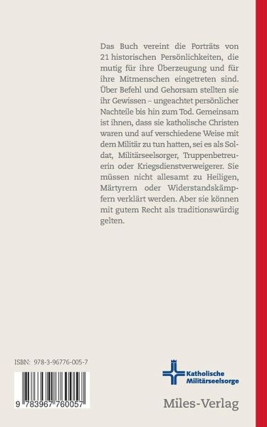 Das Buch vereint die Porträts von 21 historischen Persönlichkeiten, die mutig für ihre Überzeugung und für ihre Mitmenschen eingetreten sind. Über Befehl und Gehorsam stellten sie ihr Gewissen - ungeachtet persönlicher Nachteile bis hin zum Tod. Gemeinsam ist ihnen, dass sie katholische Christen waren und auf verschiedene Weise mit dem Militär zu tun hatten, sei es als Soldat, Militärseelsorger, Truppenbetreuerin oder Kriegsdienstverweigerer. Sie müssen nicht allesamt zu Heiligen, Märtyrern oder Widerstandskämpfern verklärt werden. Aber sie können mit gutem Recht als traditionswürdig gelten.