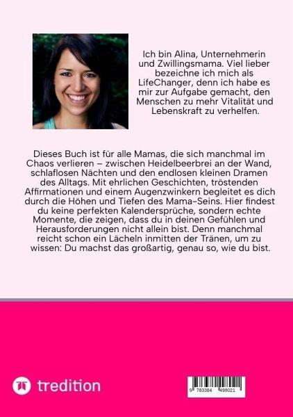 Dieses Buch ist für alle Mamas, die sich manchmal im Chaos verlieren - zwischen Heidelbeerbrei an der Wand, schlaflosen Nächten und den endlosen kleinen Dramen des Alltags. Mit ehrlichen Geschichten, tröstenden Affirmationen und einem Augenzwinkern begleitet es dich durch die Höhen und Tiefen des Mama-Seins. Hier findest du keine perfekten Kalendersprüche, sondern echte Momente, die zeigen, dass du in deinen Gefühlen und Herausforderungen nicht allein bist. Denn manchmal reicht schon ein Lächeln inmitten der Tränen, um zu wissen: Du machst das großartig, genau so, wie du bist.