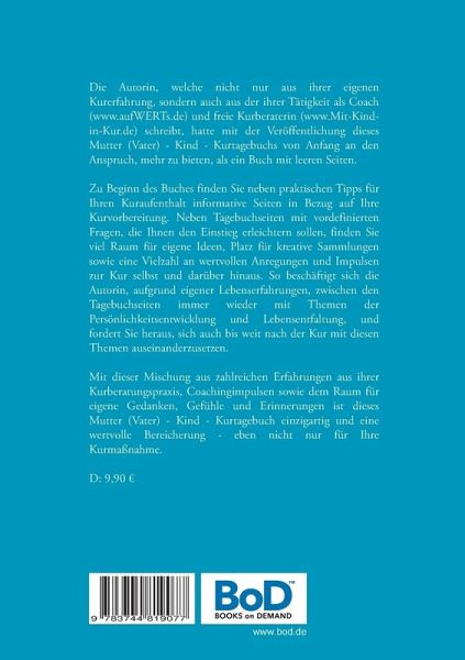 Die Autorin, welche nicht nur aus ihrer eigenen Kurerfahrung, sondern auch aus der ihrer Tätigkeit als Coach (www.aufWERTs.de) und freie Kurberaterin (www.Mit-Kind-in-Kur.de) schreibt, hatte mit der Veröffentlichung dieses Mutter (Vater) - Kind - Kurtagebuchs von Anfang an den Anspruch, mehr zu bieten, als ein Buch mit leeren Seiten. Zu Beginn des Buches finden Sie neben praktischen Tipps für Ihren Kuraufenthalt informative Seiten in Bezug auf Ihre Kurvorbereitung. Neben Tagebuchseiten mit vordefinierten Fragen, die Ihnen den Einstieg erleichtern sollen, finden Sie viel Raum für eigene Ideen, Platz für kreative Sammlungen sowie eine Vielzahl an wertvollen Anregungen und Impulsen zur Kur selbst und darüber hinaus. So beschäftigt sich die Autorin, aufgrund eigener Lebenserfahrungen, zwischen den Tagebuchseiten immer wieder mit Themen der Persönlichkeitsentwicklung und Lebensentfaltung, und fordert Sie heraus, sich auch bis weit nach der Kur mit diesen Themen auseinanderzusetzen.Mitdieser Mischung aus zahlreichen Erfahrungen aus ihrer Kurberatungspraxis, Coachingimpulsen sowie dem Raum für eigene Gedanken, Gefühle und Erinnerungen ist dieses Mutter (Vater) - Kind - Kurtagebuch einzigartig und eine wertvolle Bereicherung - eben nicht nur für Ihre Kurmaßnahme.
