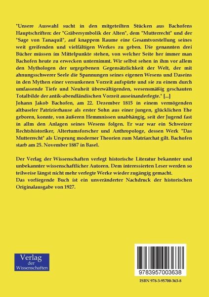 "Unsere Auswahl sucht in den mitgeteilten Stücken aus Bachofens Hauptschriften: der "Gräbersymbolik der Alten", dem "Mutterrecht" und der "Sage von Tanaquil", auf knappem Raume eine Gesamtvorstellung seines weit greifenden und vielfältigen Werkes zu geben. Die genannten drei Bücher müssen im Mittelpunkte stehen, von welcher Seite her immer man Bachofen heute zu erwecken unternimmt. Wir selbst sehen in ihm vor allem den Mythologen der urgegebenen Gegensätzlichkeit der Welt, der mit ahnungsschwerer Seele die Spannungen seines eigenen Wesens und Daseins in den Mythen einer versunkenen Vorzeit aufspürte und sie zu einem durch umfassende Tiefe und Neuheit überwältigenden, wesensmäßig geschauten Totalbilde der antik-abendländischen Vorzeit auseinanderlegte." [...]