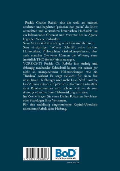 Freddy Charles Rabak- eine der wohl am meisten verehrten und begehrten "personae non gratae" des leicht versnobten und verstaubten literarischen Hochadels- ist ein bekennender Chronist und Vertreter der in Agonie liegenden Wiener Subkultur. Seine Neider sind ihm neidig, seine Fans sind ihm treu. Sein einzigartiger "Wiener Schmäh", seine Satiren, Humoresken, Philosophien, Gedankenspielereien aber auch mancher Zyniymus könnten die Wirkung eines (natürlich THC-freien) Joints erzeugen. VORSICHT! Freddy Ch. Rabaks fast süchtig und abhängig machender Schreibstil könnte mit seinen gar nicht so unangenehmen Nebenwirkungen wie ein "Tütchen" wirken! Er sorgt vielleicht für einen fast unstillbaren Heißhunger nach mehr Lese-"Stofff" und die Leser_Innen müssen auf plötzlich auftretende Lachanfälle samt Bauchschmerzen nicht achten, weil sie als vom Autor gewünschte Lese- Nebenwirkung auftreten .Im Zweifel fragen Sie einen Dealer, Polizisten, Psychiater oder Soziologen ihres Vertrauens. Für eine nachlässig eingenommene Kapitel-Überdosis übernimmt Rabak keine Haftung.