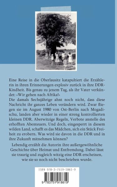 Eine Reise in die Oberlausitz katapultiert die Erzählerin in ihren Erinnerungen explosiv zurück in ihre DDR-Kindheit. Bis genau zu jenem Tag, als ihr Vater verkündet: »Wir gehen nach Afrika!«Die damals Sechsjährige ahnt noch nicht, dass diese Nachricht ihr ganzes Leben verändern wird. Zwar fliegen sie im August 1980 von Ost-Berlin nach Mogadischu, landen aber wieder in einer streng kontrollierten kleinen DDR. Aberwitzige Regeln, Verbote anstelle des erhofften Abenteuers. Und doch, eingesperrt in diesem wilden Land, schafft es das Mädchen, sich ein Stück Freiheit zu erobern. Was wird sie davon in die DDR und in ihre Zukunft mitnehmen können?Lebendig erzählt die Autorin ihre außergewöhnliche Geschichte über Heimat und Entfremdung. Dabei lässt sie traurig und zugleich witzig eine DDR erscheinen, wie sie so noch nicht beschrieben wurde.