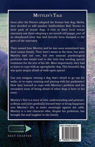 Soon after the Porters adopted the former bait dog, Sheba, they decided to add another Staffordshire Bull Terrier to their pack of rescue dogs. A visit to their local rescue sanctuary saw them adopting a six-month old puppy, part of an abandoned litter that had literally been dumped at the gates of the sanctuary. They named him Muttley and he was soon assimilated into their canine family. They were't aware at the time, but poor Muttley had not one, but two unusual psychological problems that would lead to this little boy needing special treatment for the rest of his life. Most importantly, they had to learn to cope with an agoraphobic dog. This beautiful dog was quite simply afraid of wide open spaces! Can you imagine owning a dog that's afraid to go out for walks, or to enjoy running and playing with his packmates? How they learned to cope with Muttley's problem and his secondary issue of being afraid of other dogs is here in his story. Muttley's Tale is a story of love, understanding and patience, as Brian and Juliet gradually learned ways to bring happiness into Muttley's life, at times seemingly against the odds. Muttley is a real character who, despite his problems, has brought fun and laughter to the family.