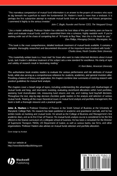 'This masterfully written book is a 'must read' forthose who want to make informed decisions about mutual funds. JackHaslem's definitive treatment of the subject sets a new standardfor excellence. His clarity of style and solidity of researchresult in fascinating reading.' H. Kent Baker, AmericanUniversity
