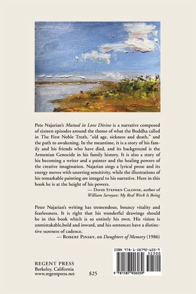 Pete Najarian's Mutual in Love Divine is a narrative composed of sixteen episodes around the theme of what the Buddha called in The First Noble Truth, "old age, sickness and death," and the path to awakening. In the meantime, it is a story of his family and his friends who have died, and its background is the Armenian Genocide in his family history. It is also a story of his becoming a writer and a painter and the healing powers of the creative imagination. Najarian sings a lyrical prose and its energy moves with unerring sensitivity, while the illustrations of his remarkable painting are integral to his narrative. Here in this book he is at the height of his powers