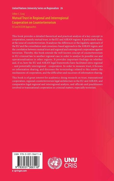 This book provides a detailed theoretical and practical analysis of a key concept in cooperation, namely mutual trust, in the EU and ASEAN regions. It particularly looks at the issue of counterterrorism. It analyses the differences in the legalistic approach of the EU and the consultation and consensus-based approach in the ASEAN region, and the correlation between mutual trust and regional and interregional cooperation against terrorism. Thereby, this book extends the well-known concept of counterterrorism in EU criminal law to another regional case in order to analyse its possible use and operationalisation in other regions. It provides important findings on whether and, if so, how the EU and ASEAN legal frameworks have facilitated intra-regional - and potentially interregional - cooperation. In order to measure trust, it focuses on information sharing, and discusses the terminology related to this matter, the mechanisms of cooperation, and the difficulties and successes ofinformation sharing.