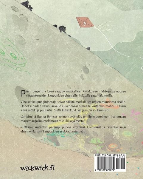 On his sailing trip, Leo the little wanderer arrives at a rocky bay and disembarks on a deserted pier. It belongs to two towns that are feuding furiously with one another. The angry mayors won't allow the traveler inside their stone walls. But luckily for Leo, between the two towns lies a piece of land that nobody owns. It is just big enough for his neat little cabin and garden, where many flowers bloom and the beautiful sounds of his violin fill the air. On warm nights, people climb onto the walls together to admire the view and listen to the music and the sea. "Would it be better, after all, to tear down the walls that separate us?" the townsfolk begin to wonder. --- Pieni purjehtija Lauri saapuu matkallaan kivikkoiseen lahteen ja nousee riitaantuneiden kaupunkien yhteiselle, hylätylle satamalaiturille. Vihaiset kaupunginjohtajat eivät päästä matkalaista omien muuriensa sisälle. Onneksi niiden väliin jäävälle ei-kenenkään-maalle kuitenkin mahtuu Laurin sievä mökki ja puutarha. Siellä kukat kukkivat ja viulu soi kauniisti. Lämpiminä iltoina ihmiset kokoontuvat ylös omille muureilleen ihailemaan maisemaa ja kuuntelemaan musiikkia ja merta. - Olisiko kuitenkin parempi purkaa erottavat kivimuurit ja rakentaa uusi yhteinen laituri? kaupunkien asukkaat miettivät.