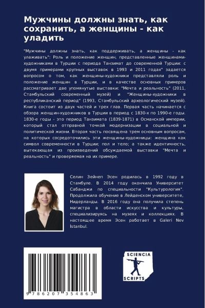 "Muzhchiny dolzhny znat', kak podderzhiwat', a zhenschiny - kak ulazhiwat'": Rol' i polozhenie zhenschin, predstawlennye zhenschinami-hudozhnikami w Turcii s perioda Tanzimat do sowremennoj Turcii: s dwumq primerami krupnyh wystawok w 1993 i 2011 godah" zadaetsq woprosom o tom, kak zhenschiny-hudozhniki predstawlqli rol' i polozhenie zhenschin w Turcii, i w kachestwe osnownyh primerow rassmatriwaet dwe upomqnutye wystawki: "Mechta i real'nost'" (2011, Stambul'skij sowremennyj muzej) i "Zhenschiny-hudozhniki w respublikanskij period" (1993, Stambul'skij arheologicheskij muzej). Kniga sostoit iz dwuh chastej i treh glaw. Perwaq chast' nachinaetsq s obzora zhenschin-hudozhnikow w Turcii w period s 1830-h po 1990-e gody. 1830-e gody - äto period Tanzimata (1839-1871) w Osmanskoj imperii, kotoryj stal otprawnoj tochkoj modernizacii w social'noj i politicheskoj zhizni. Vtoraq chast' poswqschena trem osnownym woprosam, na kotoryh sosredotochilis' äti zhenschiny-hudozhnicy: zhenschina kak simwol sowremennosti w Turcii; pol i telo; a takzhe identichnost', wytekaüschaq iz proizwedenij obsuzhdaemoj wystawki "Mechta i real'nost'" i prowerqemaq na ih primere.
