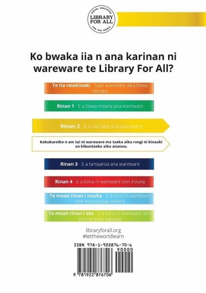 Mwemwe was a girl who admired cats. She had a cat named Brownie. When Brownie died, she got another cat with black colour and she named it Blacky. Mwemwe bon te teeinnaine ae e taatangira te man ae te katamwa. Iai ana katamwa ae arana Buraaunii. Ngke e mate Buraaunii, ao e a manga reke ana katamwa ae e roroo ao e a manga aranna bwa Buraekii. Your purchase of this book supports Library For All in its mission to make knowledge available to all, equally.