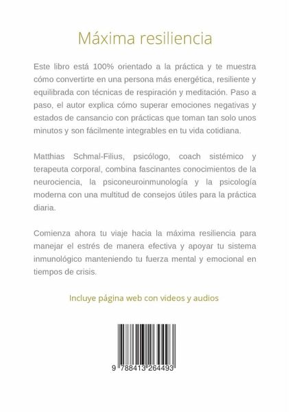 Vivimos en una época de profundos cambios. En consecuencia, tenemos el gran reto de adaptarnos rápidamente y encontrar nuevas estrategias para hacer frente a los desafíos. Cuanto más estables nos encontremos internamente, más resistentes y hábiles seremos para enfrentarnos al mundo exterior. Este libro está 100% orientado a la práctica y te muestra cómo convertirte en una persona más energética, resiliente y equilibrada con técnicas de respiración y meditación. Paso a paso, el autor explica cómo superar emociones negativas y estados de cansancio con prácticas que toman tan solo unos minutos y son fácilmente integrables en tu vida cotidiana. Matthias Schmal-Filius, psicólogo, coach sistémico y terapeuta corporal, combina fascinantes conocimientos de la neurociencia, la psiconeuroinmunología y la psicología moderna con una multitud de consejos útiles para la práctica diaria. Comienza ahora tu viaje hacia la máxima resiliencia para manejar el estrés de manera efectiva y apoyar tu sistema inmunológico manteniendo tu fuerza mental y emocional en tiempos de crisis. El libro viene acompañado de una página web que te ofrece una serie de videos y grabaciones de audio para las diferentes prácticas.