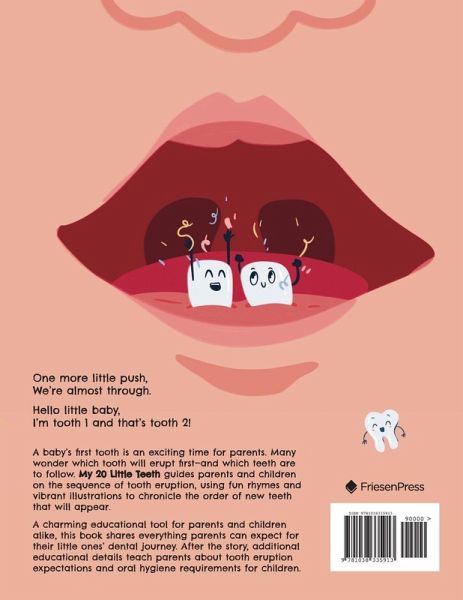 One more little push, We're almost through. Hello little baby, I'm tooth 1 and that's tooth 2! A baby's first tooth is an exciting time for parents. Many wonder which tooth will erupt first-and which teeth are to follow. My 20 Little Teeth guides parents and children on the sequence of tooth eruption, using fun rhymes and vibrant illustrations to chronicle the order of new teeth that will appear. A charming educational tool for parents and children alike, this book shares everything parents can expect for their little ones' dental journey. After the story, additional educational details teach parents about tooth eruption expectations and oral hygiene requirements for children.