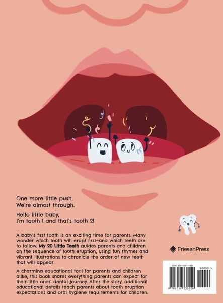 One more little push, We're almost through. Hello little baby, I'm tooth 1 and that's tooth 2! A baby's first tooth is an exciting time for parents. Many wonder which tooth will erupt first-and which teeth are to follow. My 20 Little Teeth guides parents and children on the sequence of tooth eruption, using fun rhymes and vibrant illustrations to chronicle the order of new teeth that will appear. A charming educational tool for parents and children alike, this book shares everything parents can expect for their little ones' dental journey. After the story, additional educational details teach parents about tooth eruption expectations and oral hygiene requirements for children.