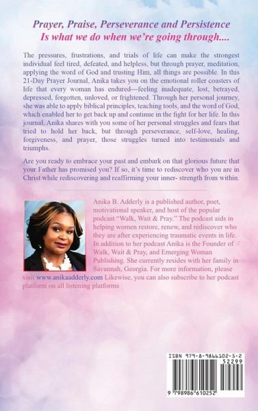 The pressures, frustrations, and trials of life can make the strongest individual feel tired, defeated, and helpless, but through prayer, meditation, applying the word of God and trusting Him, all things are possible. In this 21-Day Prayer Journal, Anika takes you on the emotional roller coasters of life that every woman has endured-feeling inadequate, lost, betrayed, depressed, forgotten, unloved, or frightened. Through her personal journey, she was able to apply biblical principles, teaching tools, and the word of God, which enabled her to get back up and continue in the fight for her life. In this journal, Anika shares with you some of her personal struggles and fears that tried to hold her back, but through perseverance, self-love, healing, forgiveness, and prayer, those struggles turned into testimonials and triumphs. Are you ready to embrace your past and embark on that glorious future that your Father has promised you? If so, it's time to rediscover who you are in Christ while rediscovering and reaffirming your inner- strength from within.