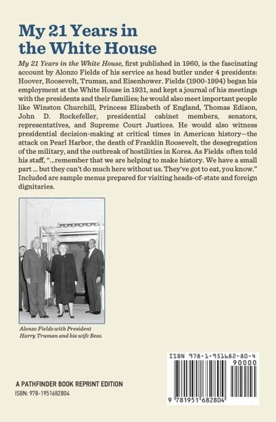 My 21 Years in the White House, first published in 1960, is the fascinating account by Alonzo Fields of his service as head butler under 4 presidents: Hoover, Roosevelt, Truman, and Eisenhower. Fields (1900-1994) began his employment at the White House in 1931, and kept a journal of his meetings with the presidents and their families; he would also meet important people like Winston Churchill, Princess Elizabeth of England, Thomas Edison, John D. Rockefeller, presidential cabinet members, senators, representatives, and Supreme Court Justices. He would also witness presidential decision-making at critical times in American history-the attack on Pearl Harbor, the death of Franklin Roosevelt, the desegregation of the military, and the outbreak of hostilities in Korea. As Fields often told his staff, "...remember that we are helping to make history. We have a small part ... but they can't do much here without us. They've got to eat, you know." Included are sample menus prepared for visiting heads-of-state and foreign dignitaries.