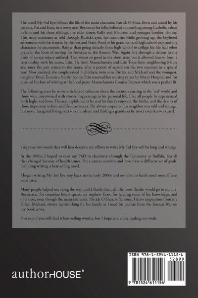 The novel My 3rd Eye follows the life of the main character, Patrick O'Shea. Born and raised by his parents, Pat and Kate, in a town near Boston as his folks believed in instilling strong Catholic values in him and his three siblings, the elder sisters Kelly and Maureen and younger brother Timmy. This story continues as told through Patrick's eyes, his memories while growing up, the boyhood adventures with his friends by the fort and Pete's Pond to his grammar and high school days and the characters he encounters. Rather than going directly from high school to college his life had other plans in the form of serving for America in the Korean War. Again fate through a detour in the form of an eye injury suffered. That wasn't so good in the short term but it allowed him to form a relationship with his nurse, Erin. He from Massachusetts and Erin Toles from neighboring Maine and once the pair return to the states, after a period of separation the two reunited in a special way. Now married, the couple raised 3 children, twin sons Patrick and Michael and the youngest, daughter Erica. To earn a family income Erin resumed her nursing career by Mercy Hospital and Pat pursued his love of writing at the local paper Massachusetts Courier Express which was a perfect fit. The following years he wrote articles and columns about the events occurring in the 'real' world and those were intertwined with stories, happenings in his personal life. Like all people he experienced both highs and lows. The accomplishments he and his family enjoyed, the births, and the deaths of those important to him and the discoveries. He always suspected his neighbor was odd and strange, but never imagined living next to a murderer and finding a grandson he never even knew existed.