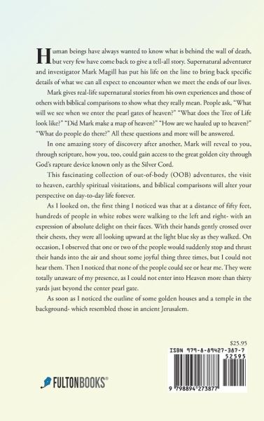 Human beings have always wanted to know what is behind the wall of death, but very few have come back to give a tell-all story. Supernatural adventurer and investigator Mark Magill has put his life on the line to bring back specific details of what we can all expect to encounter when we meet the ends of our lives. Mark gives real-life supernatural stories from his own experiences and those of others with biblical comparisons to show what they really mean. People ask, "What will we see when we enter the pearl gates of heaven?" "What does the Tree of Life look like?" "Did Mark make a map of heaven?" "How are we hauled up to heaven?" "What do people do there?" All these questions and more will be answered. In one amazing story of discovery after another, Mark will reveal to you, through scripture, how you, too, could gain access to the great golden city through God's rapture device known only as the Silver Cord. This fascinating collection of out-of-body (OOB) adventures, the visit to heaven, earthly spiritual visitations, and biblical comparisons will alter your perspective on day-to-day life forever. As I looked on, the first thing I noticed was that at a distance of fifty feet, hundreds of people in white robes were walking to the left and right- with an expression of absolute delight on their faces. With their hands gently crossed over their chests, they were all looking upward at the light blue sky as they walked. On occasion, I observed that one or two of the people would suddenly stop and thrust their hands into the air and shout some joyful thing three times, but I could not hear them. Then I noticed that none of the people could see or hear me. They were totally unaware of my presence, as I could not enter into Heaven more than thirty yards just beyond the center pearl gate. As soon as I noticed the outline of some golden houses and a temple in the background- which resembled those in ancient Jerusalem.