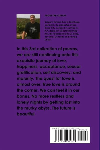 In this 3rd collection of poems, we are still continuing onto this exquisite journey of love, happiness, acceptance, sexual gratification, self discovery, and maturity. The quest for love is almost over. True love is around the corner. We can feel it in our bones. No more restless and lonely nights by getting lost into the murky abyss. The future is beautiful.