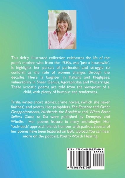 "A cleverly crafted collection of acrostic poems dedicated to [Trisha's] mother" "There is humour, love and a heart-tugging poignancy in this very special collection" This deftly illustration collection celebrates the life of the poet's mother who, from the 1950s, was 'just a housewife'. It highlights were pursuit of perfection and struggle to conform as the role of women changes through the decades. There is laughter in Kaftans and Negligees and vulnerability in Sheer Genius, Agoraphobia, and Miscarriage. These acrostic poems are told from the viewpoint of a child, with plenty of humour and tenderness. "Her writing evokes a range of emotions, and the imagery is sublime" "These poems are a wonderfully warm hug for the reader." Several of Trisha Broomfield's poems have been featured on BBC Upload. You can hear more on the podcast 'Poetry Worth Hearing'.