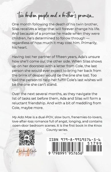 Two broken people and a brother's promise... One month following the death of his twin brother, Silas receives a letter that will forever change his life. And because of a promise he made when they were children, he's determined to follow through - regardless of how much it may cost him. Primarily, his heart. Having lost her partner of fifteen years, Ada's unsure how she'll come out the other side. When Silas shows up on her doorstep with a letter from Cole, the last person she would ever expect to bring her back from the brink of despair would be the one she lost. Too bad the person to help her fulfill Cole's last wishes will be the one she can't stand. Over the next several months, as they navigate the list of tasks set before them, Ada and Silas will form a reluctant friendship. And with a bit of meddling from Cole, maybe more. My Ada Mae is a dual-POV, slow burn, frenemies-to-lovers, love-after-loss romance full of angst, longing, and contains open-door bedroom scenes. It is the first book in the Knox County series.