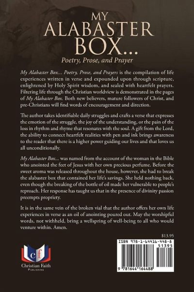 My Alabaster Box . . . Poetry, Prose, and Prayer is the compilation of life experiences written in verse and expounded upon through scripture, enlightened by Holy Spirit wisdom, and sealed with heartfelt prayers. Filtering life through the Christian worldview is demonstrated in the pages of My Alabaster Box. Both new believers, mature followers of Christ, and pre-Christians will find words of encouragement and direction. The author takes identifiable daily struggles and crafts a verse that expresses the emotion of the struggle, the joy of the understanding, or the pain of the loss in rhythm and rhyme that resonates with the soul. A gift from the Lord, the ability to connect heartfelt realities with pen and ink brings awareness to the reader that there is a higher power guiding our lives and that loves us all unconditionally. My Alabaster Box . . . was named from the account of the woman in the Bible who anointed the feet of Jesus with her own precious perfume. Before the sweet aroma was released throughout the house, however, she had to break the alabaster box that contained her life's savings. She held nothing back, even though the breaking of the bottle of oil made her vulnerable to people's reproach. Her response has taught us that in the presence of divinity passion preempts propriety. It is in the same vein of the broken vial that the author offers her own life experiences in verse as an oil of anointing poured out. May the worshipful words, not withheld, bring a wellspring of well-being to all who would venture within. Amen.