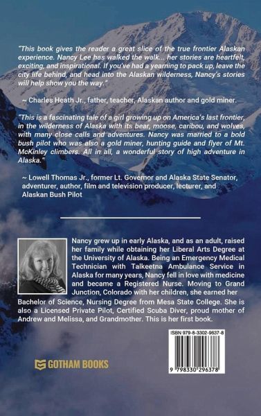 "This book gives the reader a great slice of the true frontier Alaskan experience. Nancy Lee has walked the walk... her stories are heartfelt, exciting, and inspirational. If you've had a yearning to pack up, leave the city life behind, and head into the Alaskan wilderness, Nancy's stories will help show you the way." ~ Charles Heath Jr., father, teacher, Alaskan author and gold miner. "This is a fascinating tale of a girl growing up on America's last frontier, in the wilderness of Alaska with its bear, moose, caribou, and wolves, with many close calls and adventures. Nancy was married to a bold bush pilot who was also a gold miner, hunting guide and flyer of Mt. McKinley climbers. All in all, a wonderful story of high adventure in Alaska." ~ Lowell Thomas Jr., former Lt. Governor and Alaska State Senator, adventurer, author, film and television producer, lecturer, and Alaskan Bush Pilot