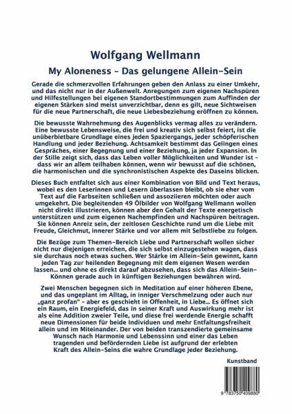 Gerade die schmerzvollen Erfahrungen geben den Anlass zu einer Umkehr, und das nicht nur in der Außenwelt. Anregungen zum eigenen Nachspüren und Hilfestellungen bei eigenen Standortbestimmungen zum Auffinden der eigenen Stärken sind meist unverzichtbar, denn es gilt, neue Sichtweisen für die neue Partnerschaft, die neue Liebesbeziehung eröffnen zu können.Die bewusste Wahrnehmung des Augenblicks vermag alles zu verändern.Eine bewusste Lebensweise, die frei und kreativ sich selbst feiert, ist die unüberbietbare Grundlage eines jeden Spaziergangs, jeder schöpferischen Handlung und jeder Beziehung. Achtsamkeit bestimmt das Gelingen eines Gespräches, einer Begegnung und einer Beziehung, ja jeder Expansion. In der Stille zeigt sich, dass das Leben voller Möglichkeiten und Wunder ist - dass wir an allem teilhaben können, wenn wir bewusst auf die schönen, die harmonischen und die synchronistischen Aspekte des Daseins blicken.Dieses Buch entfaltet sich aus einer Kombination von Bild und Text heraus, wobei es den Leserinnen und Lesern überlassen bleibt, ob sie eher vom Text auf die Farbseiten schließen und assoziieren möchten oder auch umgekehrt. Die begleitenden 49 Ölbilder von Wolfgang Wellmann wollen nicht direkt illustrieren, können aber den Gehalt der Texte energetisch unterstützen und zum eigenen Nachempfinden und Nachspüren beitragen. Sie können Anreiz sein, der zeitlosen Geschichte rund um die Liebe mit Freude, Gleichmut, innerer Stärke und vor allem mit Selbstliebe zu folgen. Die Bezüge zum Themen-Bereich Liebe und Partnerschaft wollen sicher nicht nur diejenigen erreichen, die sich selbst einzugestehen wagen, dass sie durchaus noch etwas suchen. Wer Stärke im Allein-Sein gewinnt, kann jeden Tag zur heilenden Begegnung mit dem eigenen Wesen werden lassen... und ohne es direkt darauf abzusehen, dass sich das Allein-Sein-Können gerade auch in künftigen Beziehungen bewähren wird. Zwei Menschen begegnen sich in Meditation auf einer höheren Ebene, und das ungeplant im Alltag, in inniger Verschmelzung oder auch nur "ganz profan" - aber es geschieht in Offenheit, in Liebe... Es öffnet sich ein Raum, ein Energiefeld, das in seiner Kraft und Auswirkung mehr ist als eine Addition zweier Teile, und diese frei werdende Energie schafft neue Dimensionen für beide Individuen und mehr Entfaltungsfreiheit allein und im Miteinander. Der von beiden transzendierte gemeinsame Wunsch nach Harmonie und Lebenssinn und einer das Leben tragenden Beziehung.